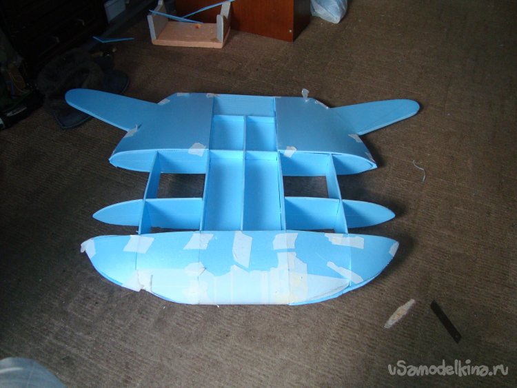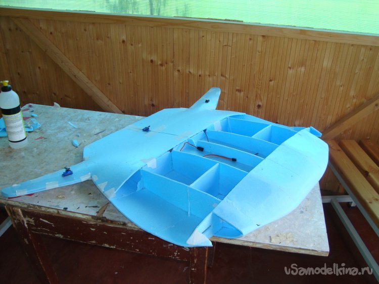 После подгонки вклеивается внутренняя . горизонтальная перегородка в центральной части крыла, она является основным связующим элементом .