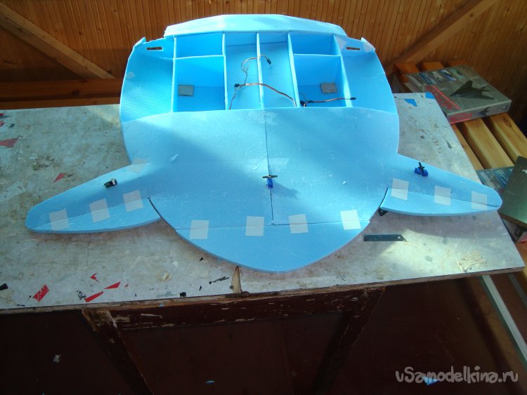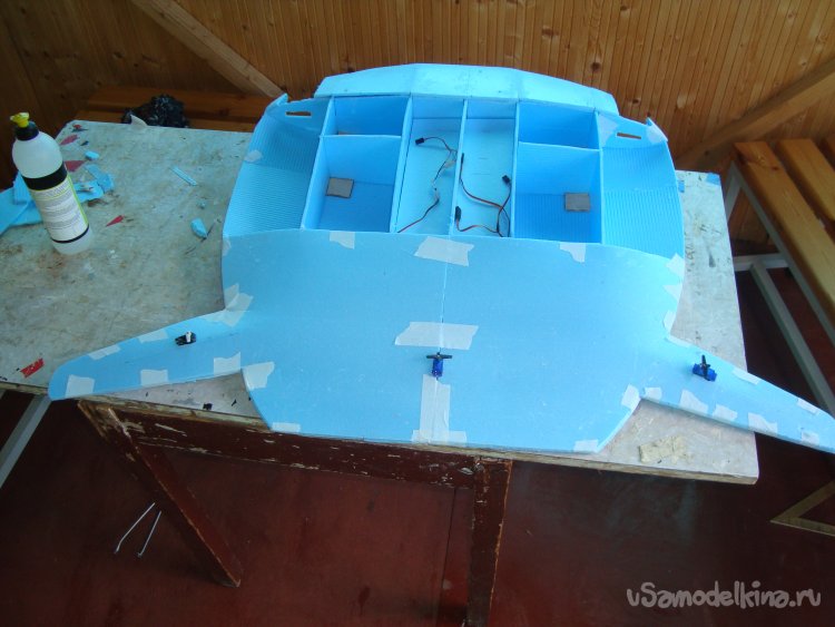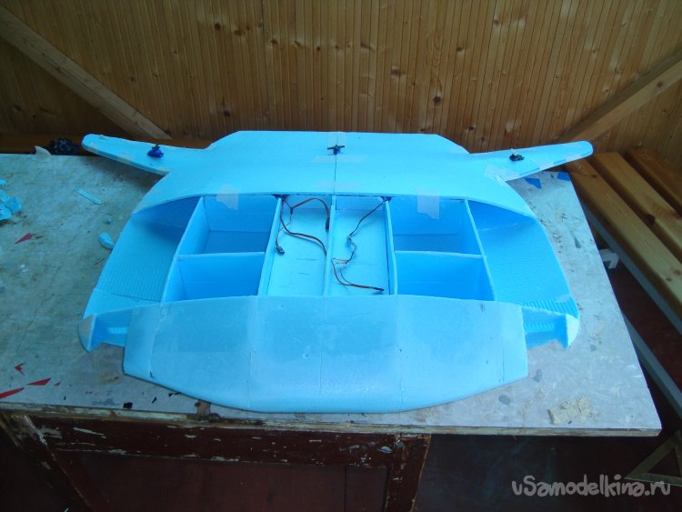 Монтирую верхнюю, внешнюю обшивку хвостовой части крыла, прокладываю провода и устанавливаю сервомашинки управления элеронами.