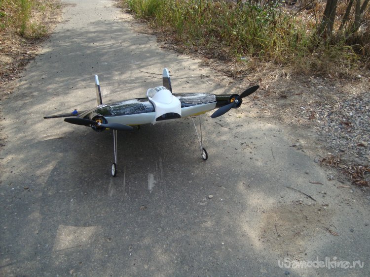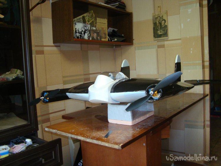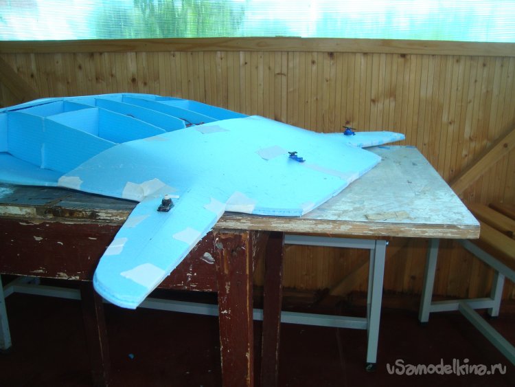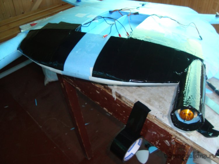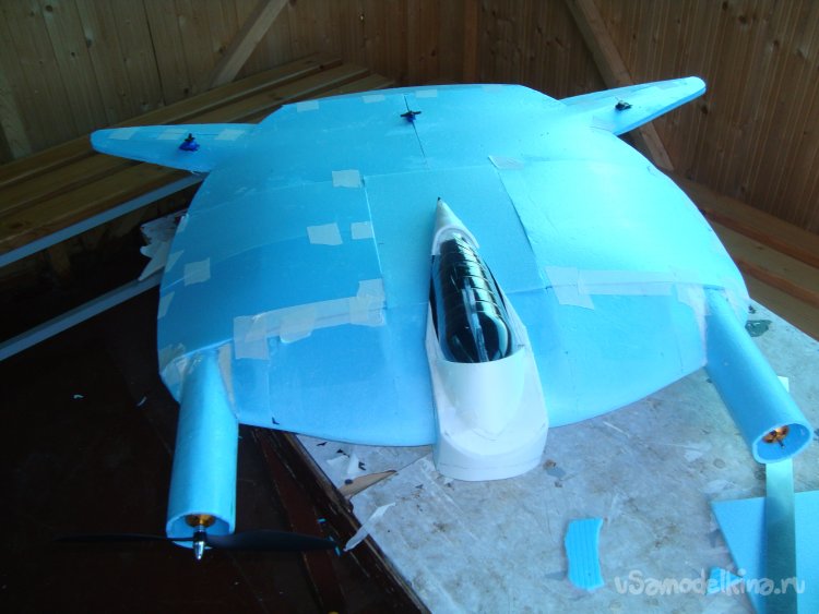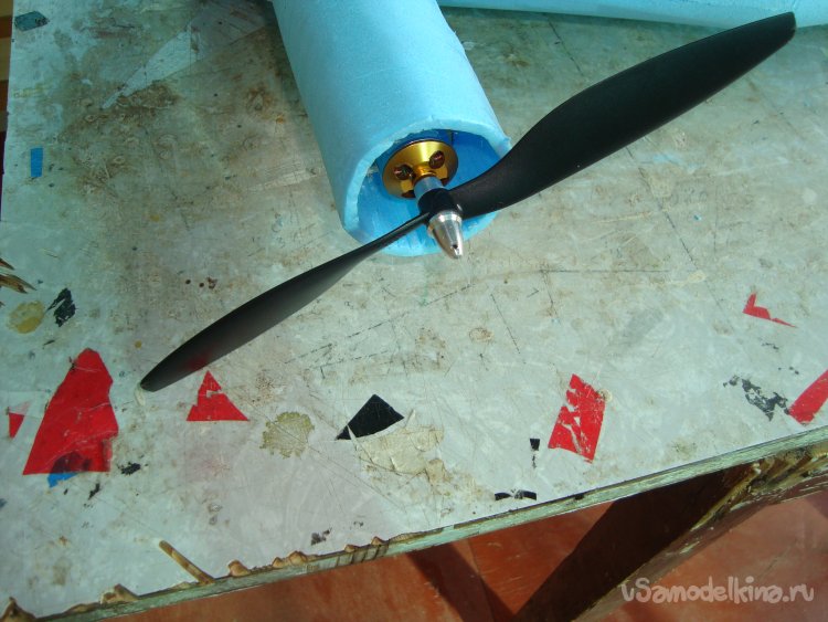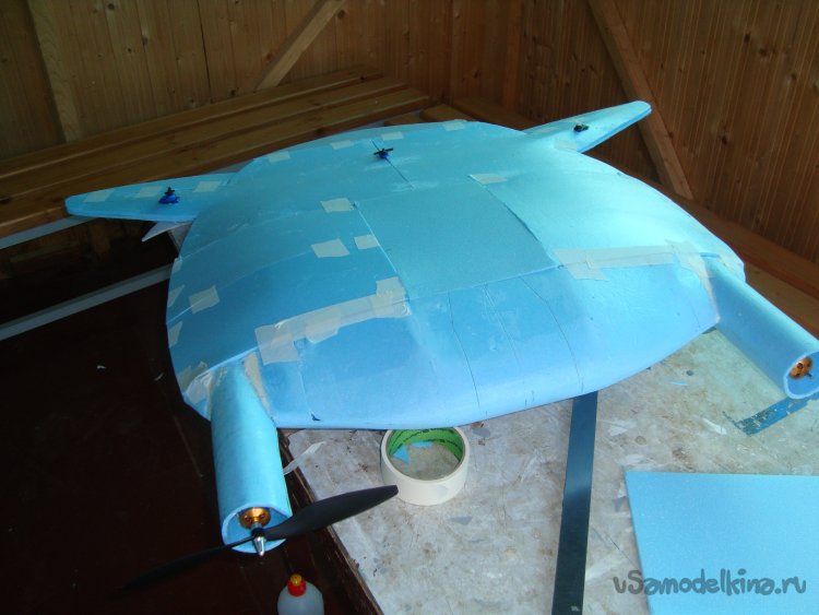Устанавливаю моторы с винтами, вклеиваю мотогондолы в крыло. Для прочности, фиксирую строительной пеной.