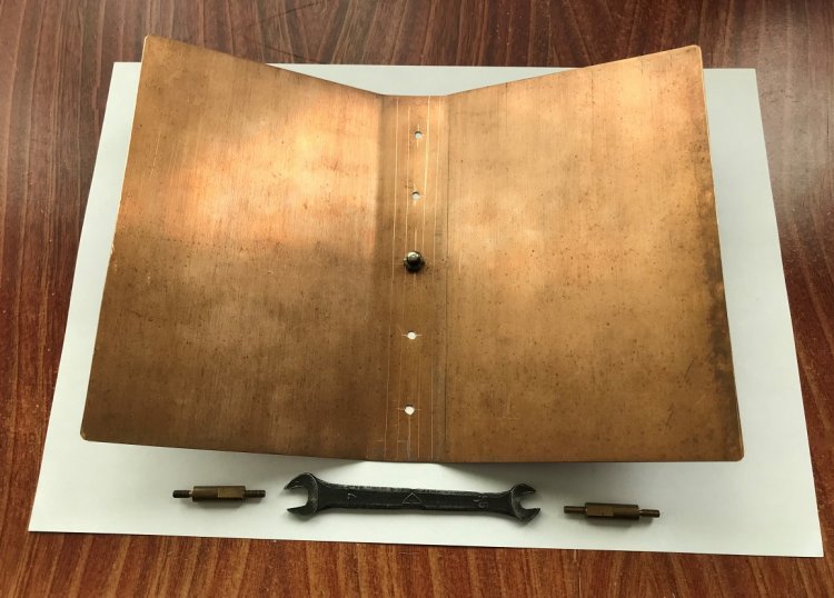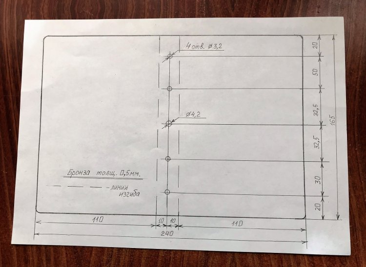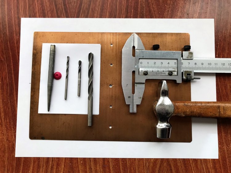 Для «проделывания» отверстий в бронзе делаем накернивание центров отверстий на деревянной подкладке. Рекомендуются: кернение с небольшой «вытяжкой» материала и сверление остро заточенным сверлом. Большое сверло используется для лёгкой зенковки отверстий вручную.