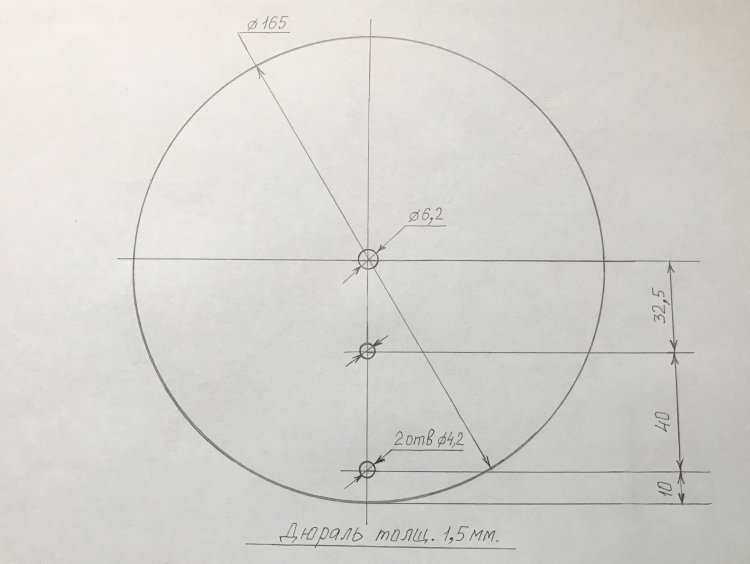 Чертёж развёртки круглого основания ЧКП3. Диаметр (4,2 мм) двух крепёжных отверстий может быть изменён от 3,2 до 6,2 мм в зависимости от имеющегося в наличии крепежа: винтов или болтов М3 … М6 длиной не менее 10 … 14 мм.