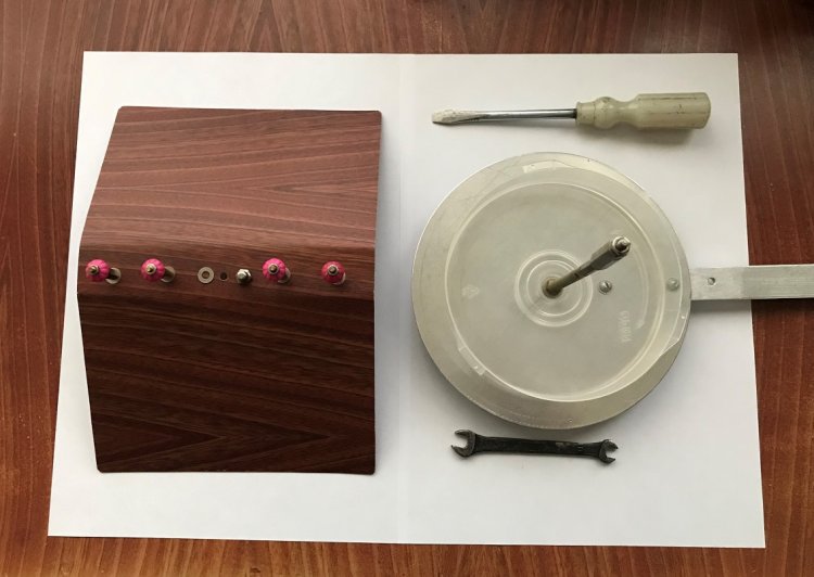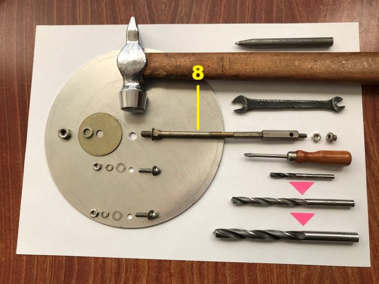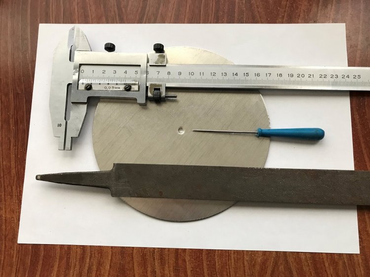 Имеющаяся заготовка основания в форме круга размечается штангенциркулем или шилом по металлической линейке, а затем накернивается на стальной металлической болванке и сверлится на деревянном основании (в соответствии с чертежом на рисунке 11). Мелкие неровности круга можно сточить на бархатном напильнике (зажатом на рабочем столе струбциной), плавно вращая круг в руке.