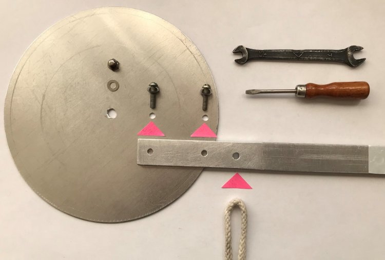 Козырёк с четырьмя установленными декоративными штырями соединяется с остальной частью кормушки. На верхнюю резьбовую часть стойки надеваются (прокладываются) простая и пружинная шайбы. Затем надеваются козырёк, простая шайба и сверху накручивается гайка-колпачок М4.