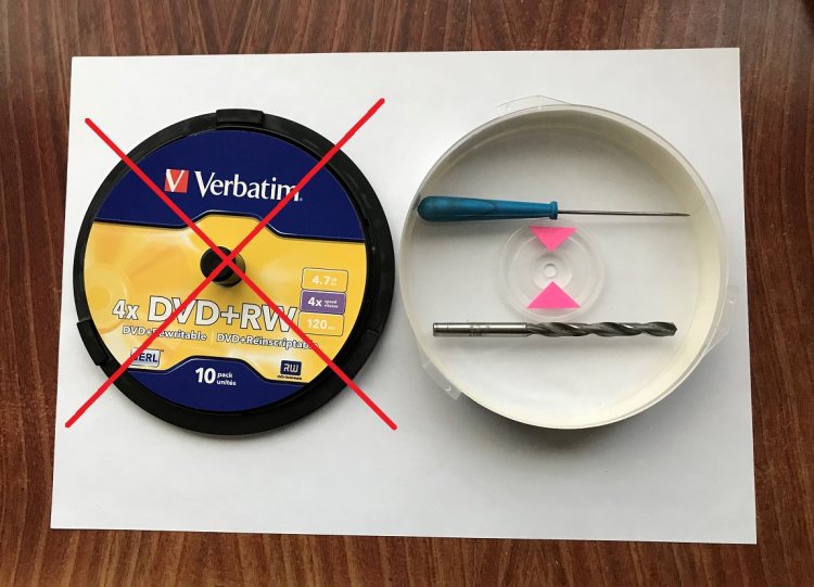 Цилиндрическая плошка взята готовой. Используется верхняя прозрачная крышка от упаковочной коробки десяти DWD+RW компьютерных дисков. В цилиндрической плошке по центру размечается шилом и сверлится отверстие диаметром 6,2 мм.