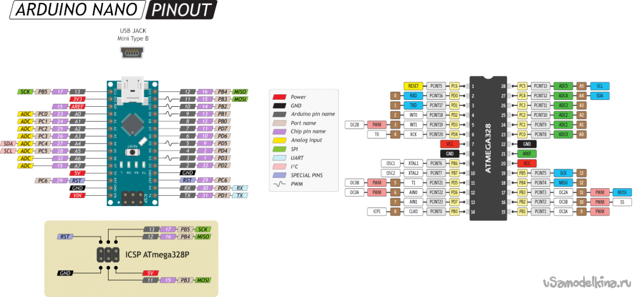 Но в Arduino у нас PB6 и PB7 отданы под тактирование внешним кварцевым генератором, и это не дает возможность подключить все адресные выводы к порту D. В ATMega328p PD0 и PD1 - это UART (без него ничего не прошьете), а PC6 - это RESET, который тоже трогать нежелательно, поэтому подключение адресных выводов к портам C и D отпадает автоматически. В итоге, если использовать Arduino, приходится делить адресные выводы по двум портам. Изначально меня это мало заботило, потому что в коде Arduino используется цифровая нумерация пинов, а вот при переходе на AVR это несколько усложнило код, потребовав много сдвиговых операций.