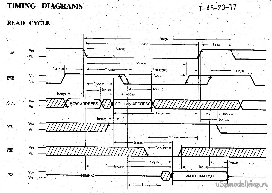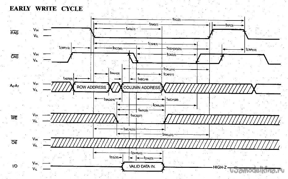 В целом все варианты памяти DRAM работают аналогично, потому что производители Siemens, Hyunday, Samsung, Sony, Hitachi просто передирали порядок и тайминги подачи напряжения на выводы микросхемы друг у друга. Ниже привожу примеры таймингов на чтение и запись для тестируемой памяти HY53C464S-10.