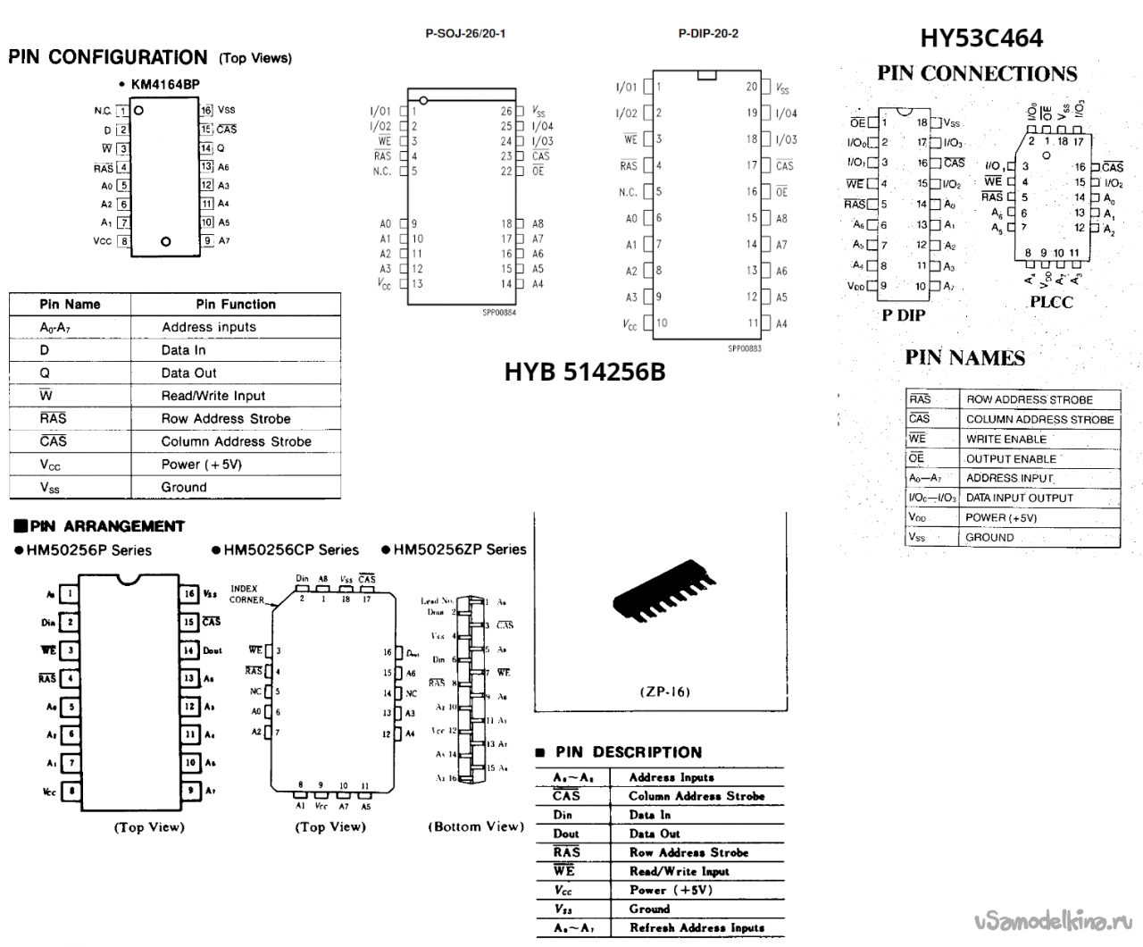 - Hyunday (HY53C464) - 18 выводов, 4 бит, 65 536 адресов (64 кбит x 4);