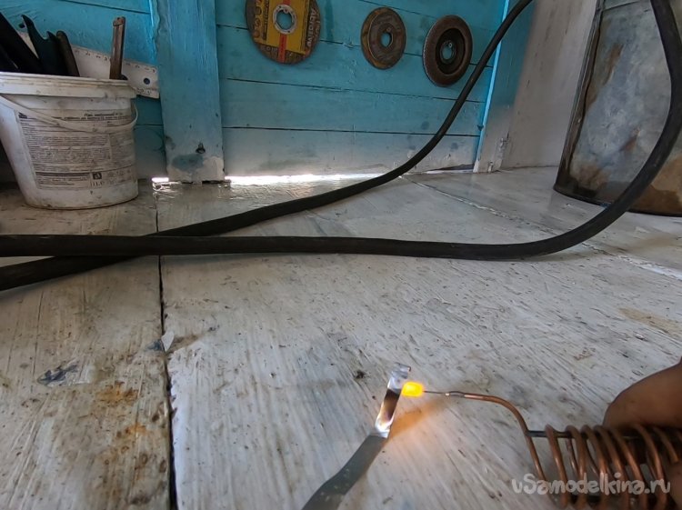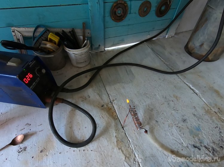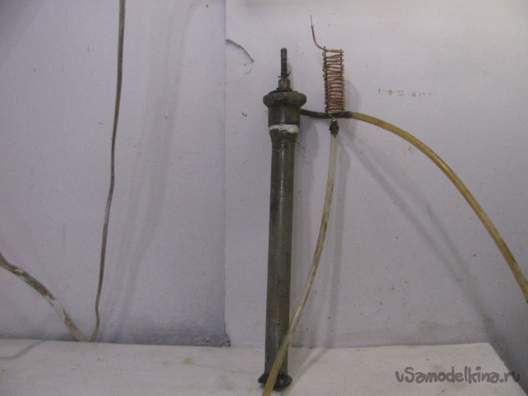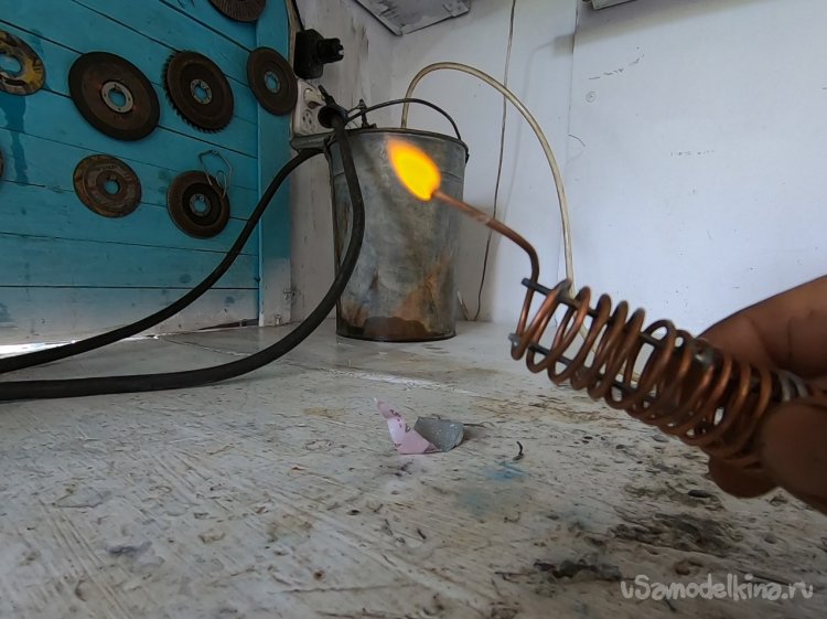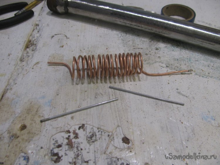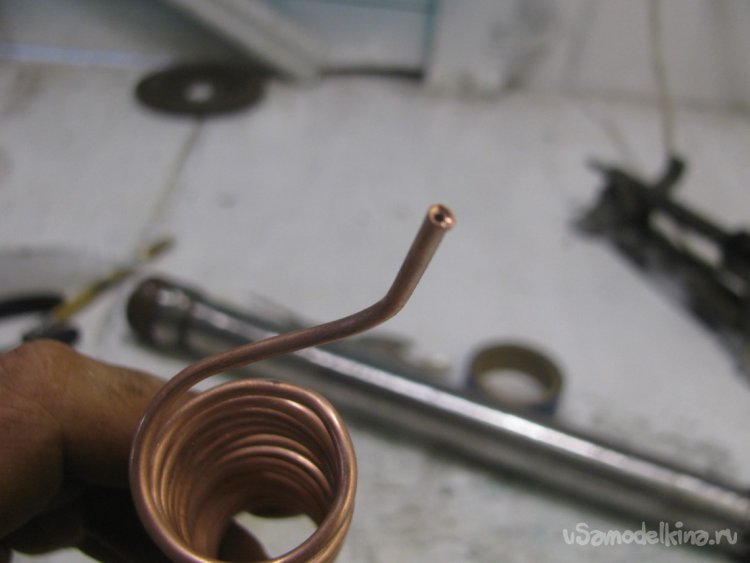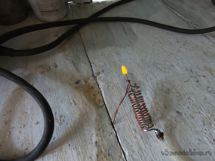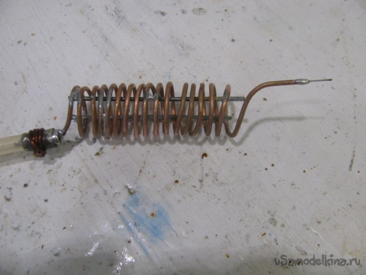 Спираль наматывалась на металлопластиковой трубе 20 мм. Горелкой выступает кончик трубы, потом я туда припаял иглу от шприца.