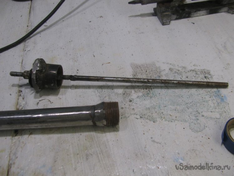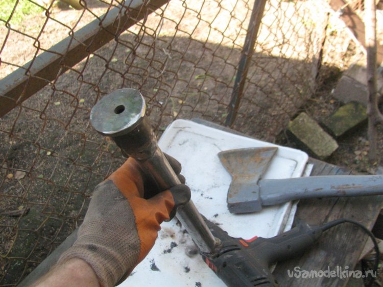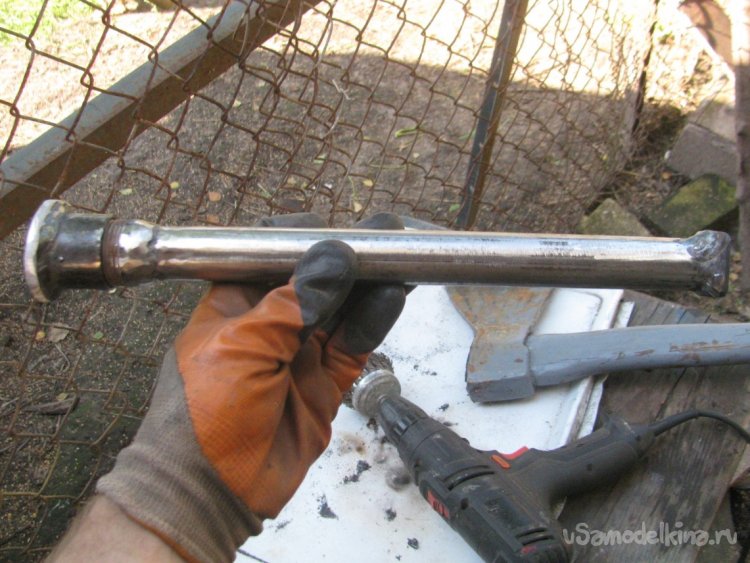 Подготавливаем кусок трубы, в нижнюю часть ввариваем заглушку из стальной пластины. На верхнюю часть надеваем и привариваем приварную резьбу, которую можно купить в строительном магазине под нужный диаметр трубы.