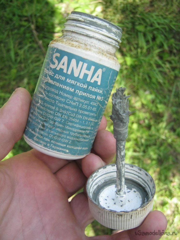 - частое применение УЗ мойки в своей мастерской – отмывка остатков кислого флюса после пайки. После полного остывания деталей жидкий флюс хорошо отмывается теплой водой. Для надежности, лучше нейтрализовать кислоту щелочью – использую водный раствор кальцинированной соды, около 0,5…3/4 чайной ложки на стакан воды. После максимального (в имеющейся модели мойки) 30 минутного цикла, промывка – еще один получасовой цикл в воде чистой. Специальный, чрезвычайно удобный в работе, флюс-паста для огневой конструктивной пайки (изначально - деталей медного водопровода) мягким оловянным припоем (Фото 2), весьма активен – отмывать немедленно после остывания, оставляет слой значительной толщины. Перед УЗ отмывкой, полезно деталь поелозить под (тёплой) водой старой зубной щеткой. При этом смывается львиная доля легкодоступных загрязнений.