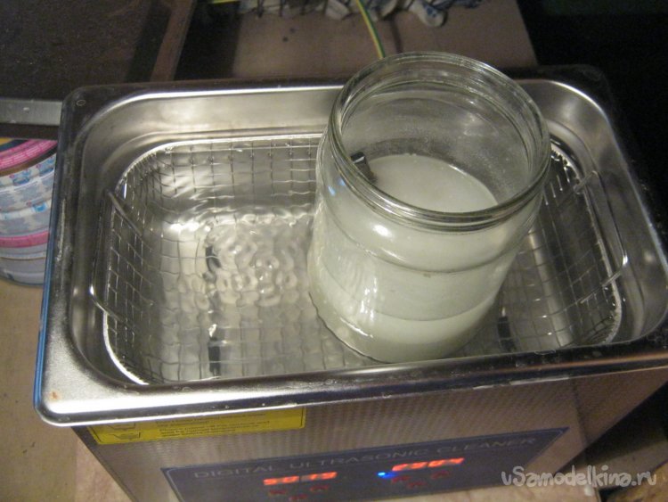 Первым делом замечу, что корытце УЗ мойки не обязательно полностью заливать специальными растворами для отмывки мелочей. Часто, удобнее поместить их в отдельную небольшую технологическую посудину, а остальное заполнить обычной водой (Фото 1). УЗ хорошо распространяется в твердых и жидких средах и без труда проникает через стенки дополнительной емкости. На фото 1, это хорошо видно по стоячим волнам. В итоге, экономится рабочий раствор, дорогой прибор не нужно всякий раз пачкать и отмывать. Встречаются, однако, сведения, о предпочтительном применении тонкостенной посуды, например из нетолстого стекла.