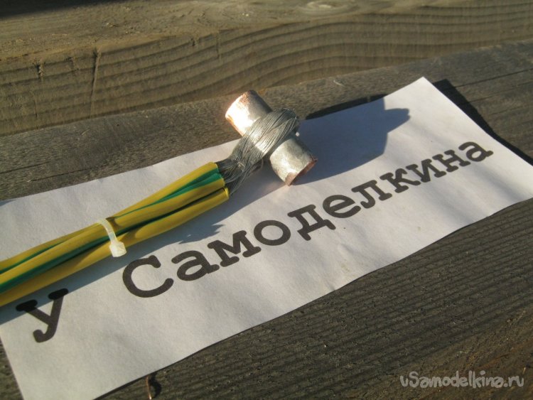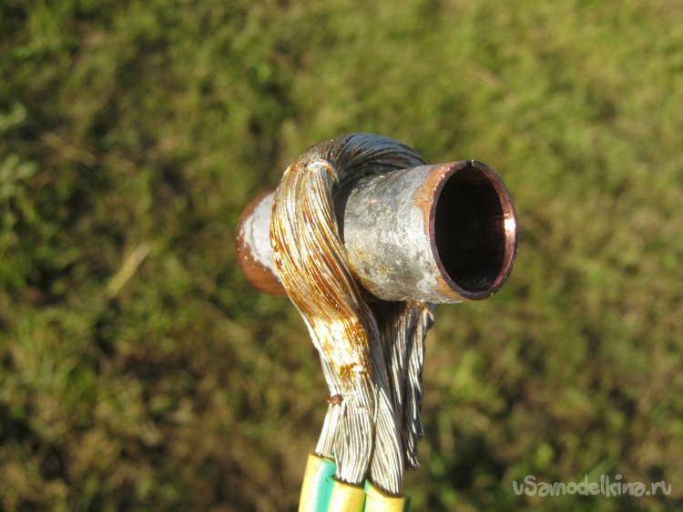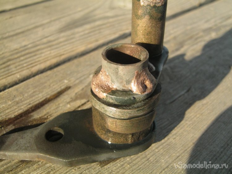 Фото 7. «Морская свинка» - паяное сильноточное соединение. Твердые стекловидные остатки табельного флюса из припоя-проволоки. Надо полагать, на основе канифоли. Чтобы не загорелся органический флюс, место пайки осторожно грел горелкой изнутри трубки.