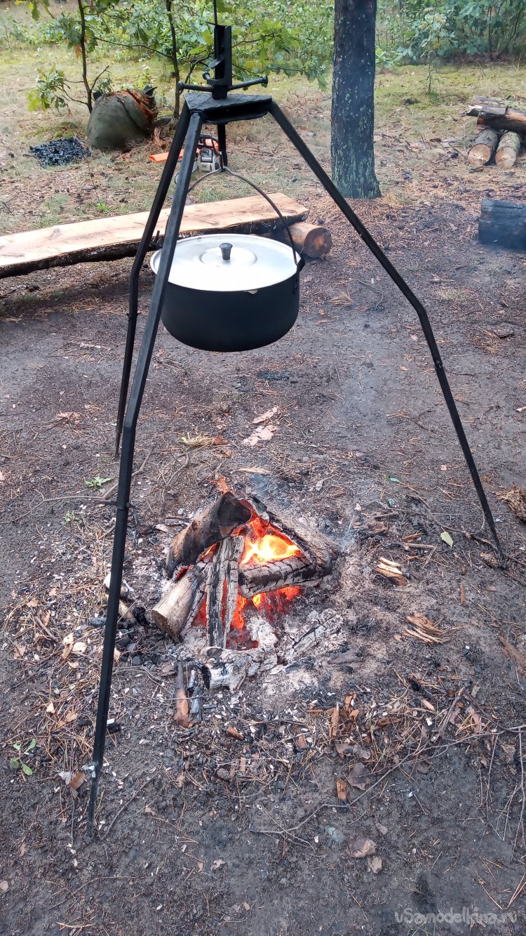В общем, комфортное пребывание "на природе" обеспечено. Готовим на костре, в чём нам очень помогает сконструированная мною тренога, позволяющая легко регулировать высоту подвеса.