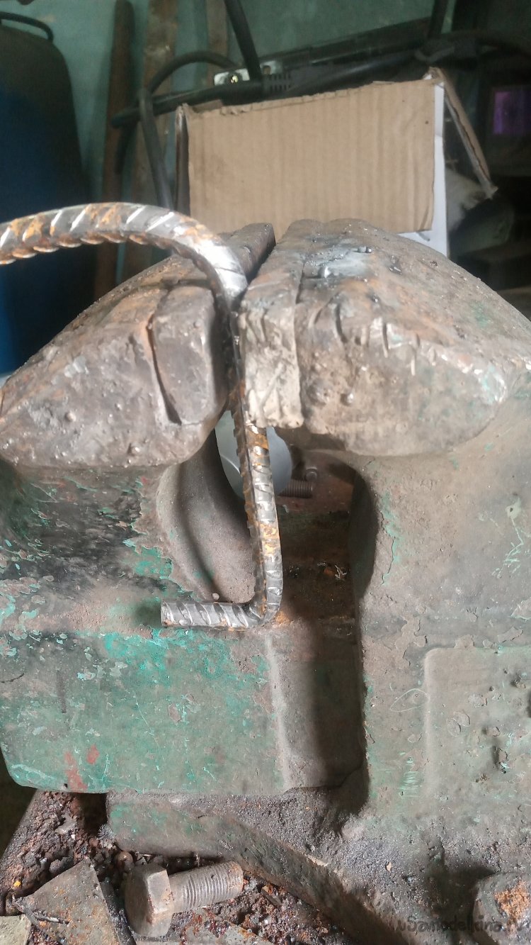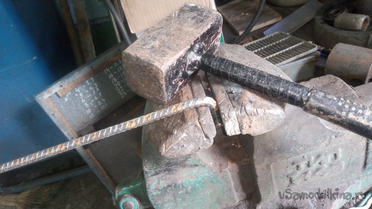 Начал с рукоятки. Зажатую в тиски арматуру сгибал, после чего формировал место сгиба ударами кувалдочки: