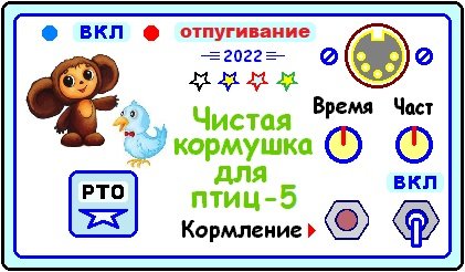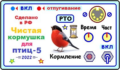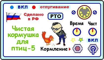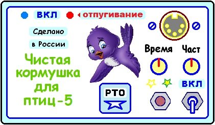 Режим «Отпугивание». На улице светло, и отпугивание включено, так как птицам предписывается не сидеть постоянно на балконе, в ожидании корма, а летать или, в крайнем случае, сидеть на близлежащем дереве, где действие отпугивающего ВЧ – излучения им почти не слышно. И птицы не нервируются ультразвуком, и балкон остаётся не испачканным отходами жизнедеятельности птиц. Когда включается режим «Кормление», птицы заняты поеданием корма и им почти нет времени пачкать кормушку и балкон. К такому строгому режиму питания птицы быстро привыкли. Кормушка открытого доступа типа «аэродром», или ВВП (площадка 60 х 40 см) через 5 минут после вбрасывания корма остаётся пустой. Так что птицы без особого желания, но быстро покидают кормушку под действием ВЧ-отпугивания.