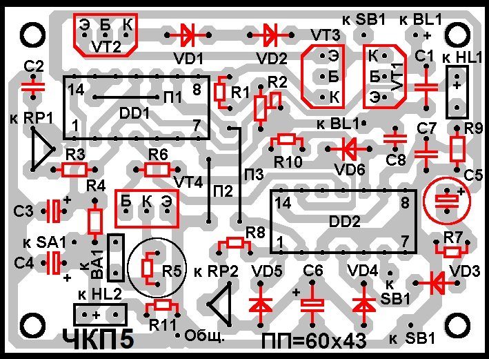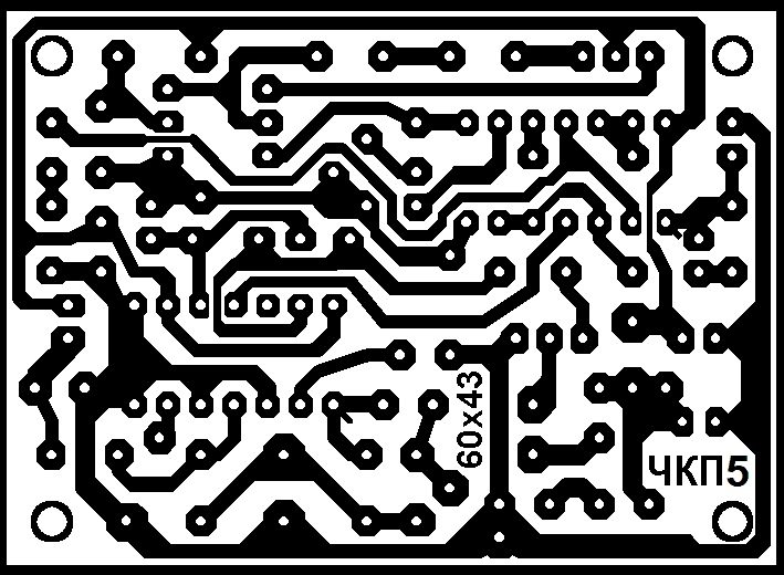 Печатная плата ЧКП5 выполнена из односторонне фольгированного стеклотекстолита размерами 60 х 43 х 1,5 мм (см. рисунки 2 и 3). Диаметр отверстий на печатной плате под микросхемы - 0,7 … 0,8 мм, под остальные радиоэлектронные компоненты – 0,8 … 1 мм, под соединительные проводники - 1…1,2 мм., под крепёжные отверстия – 2,5 мм.
