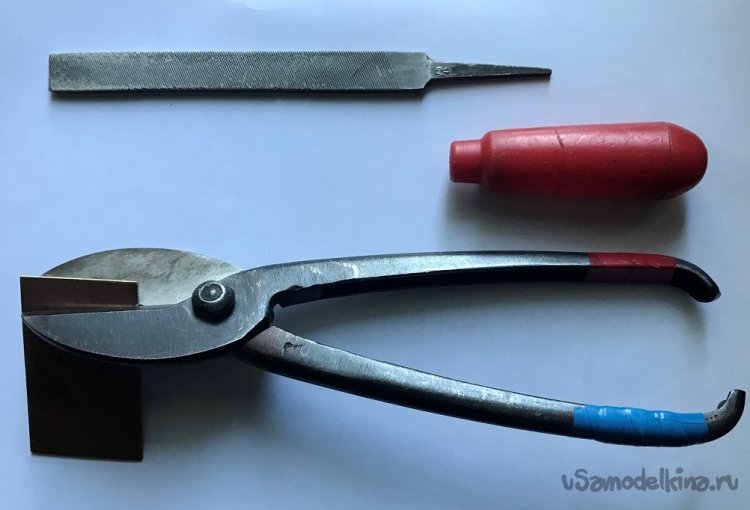 Пластины для радиатора вырезаются из куска красной меди при помощи обычного резака, изготовленного из отслужившего полотна для ножовки по металлу. Прорезание делается с обеих сторон. Когда резак начнёт проваливаться, то пластину разламывают, а её края обрабатываются напильниками.