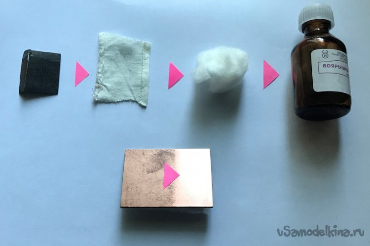 Фольгированную сторону ПП зачищают от грязи круговыми движениями мелкой шкурки и протирают ватным тампоном, смоченным спиртосодержащей жидкостью. Вместо шкурки можно использовать канцелярский ластик.