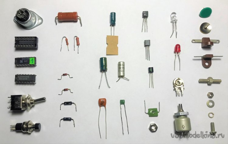 Детали, необходимые для сборки ЧКП5. Однотипные детали (резисторы, диоды, ...) для экономии места, представлены единичными экземплярами. Транзистор VT4 КТ829А смотрите на рисунках 19 и 21.