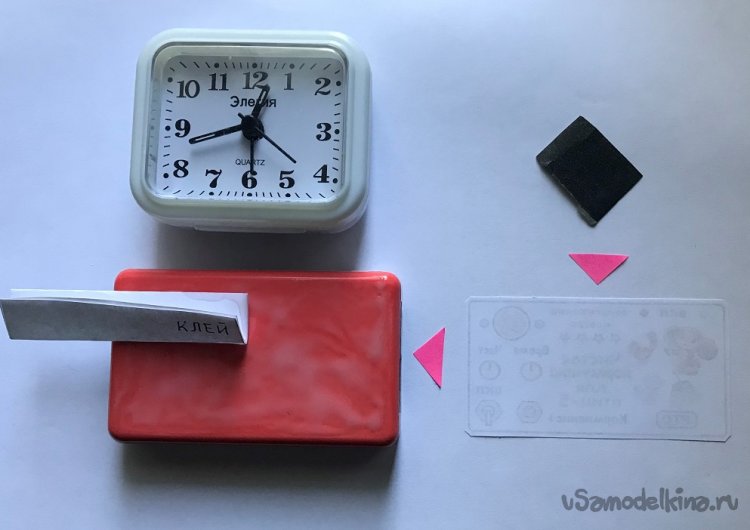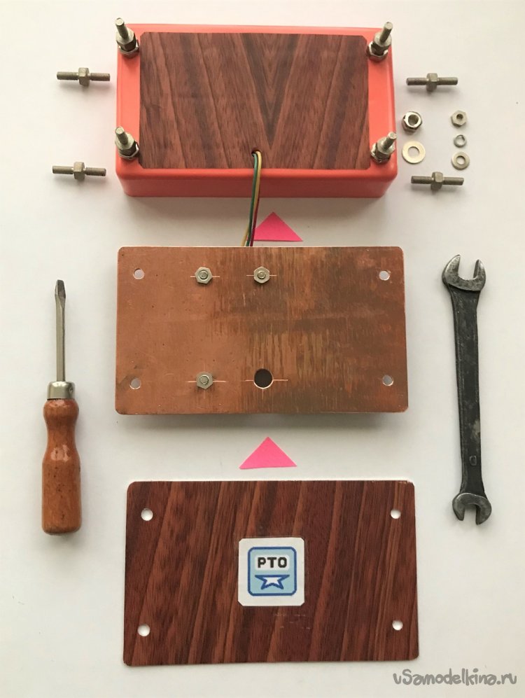 Задняя стенка (радиатор) корпуса ЧКП5 обклеена самоклеящейся плёнкой (прямоугольным кусочком размерами 100 х 60 мм) под дерево. Для скрепления обеих половинок корпуса ЧКП5 используются две цветные силовые кнопки. Под силовые кнопки PUSH PINS фирмы BRAUBERG отверстия в собранном корпусе - мыльнице делаются сверлом диаметром 1 мм. (Диаметр острой части силовой кнопки 1,1 мм.).