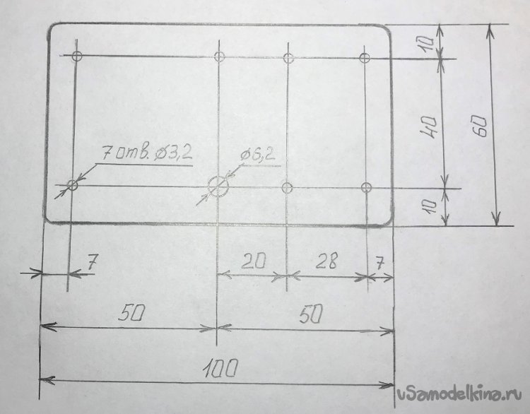 Чертёж развёртки радиатора. Для ЧКП5 изготавливаются две заготовки из листовой красной меди размерами 100 х 60 х 1 мм. Во второй заготовке сверлятся только 4 угловых отверстия диаметром 3,2 мм.