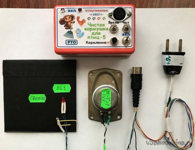 - органов управления: тумблера SA1 «Вкл» включения питания; регулятора «Частота» (18 … 27 кГц); кнопки SB1 «Кормление»; регулятора «Время», предназначенного для установки времени кормления.