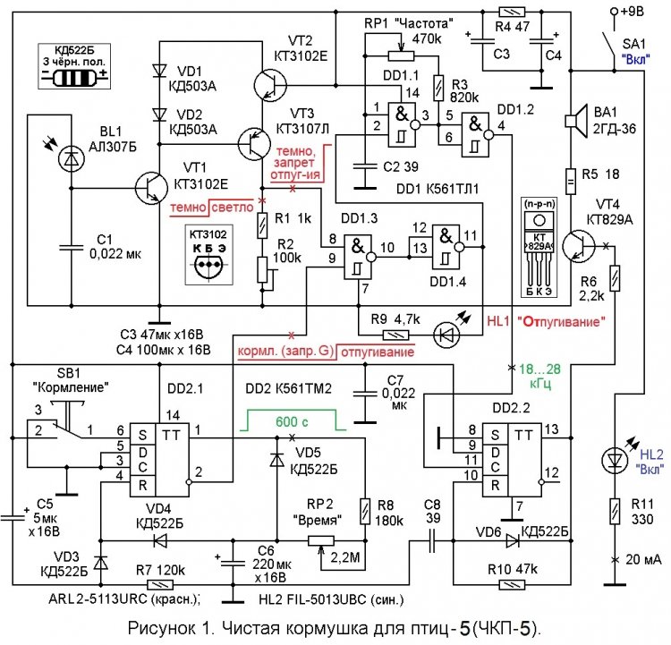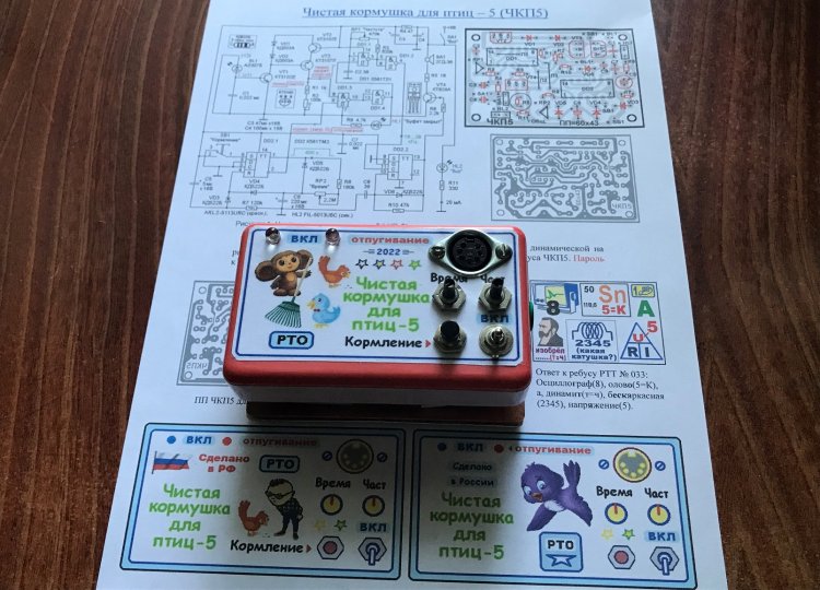 Устройство ЧКП5 составлено из трёх основных блоков: 1) фотореле, автоматически выключающего отпугивающий УЗ-генератор (ультразвуковой генератор) в светлое время суток; 2) таймера, запускаемого кнопкой «Кормление» перед выдачей корма птицам, и отключающего отпугивающий УЗ-генератор на время, установленное регулятором «Время»; 3) УЗ-генератора. В тёмное время суток птицы от кормушки всё равно куда-то улетают и их отпугивание не требуется. А пяти - десяти минут времени (особенно в большие морозы) вполне достаточно, чтобы весь корм (хлебные крошки, пшёнка, гречка - воробьям; семечки, конопляные зёрна, кусочки мяса - синицам) выложенный в кормушку, был съеден.