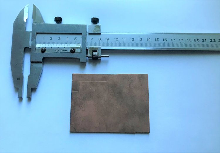Заготовка для платы ЧКП5. От прямого угла на куске стеклотекстолита штангенциркулем размечают габаритные размеры ПП.