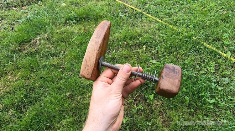 Подбираем шпильку, у меня была резьбовая. Отверстия я просверлил глухие, чтобы выглядело все аккуратнее. Нарезал резьбы в деревянных деталях этой же шпилькой. Завернув шпильку в задвижку, просверлил с торца отверстие через шпильку и загнал гвоздик, теперь точно не выпадет.