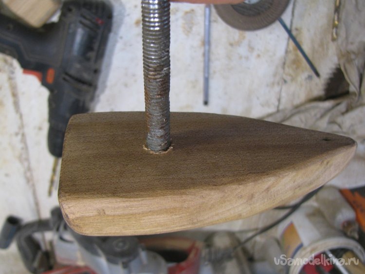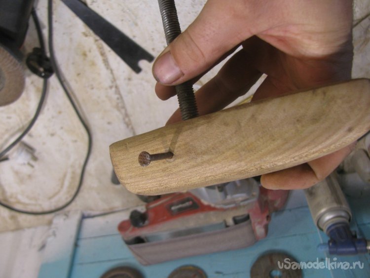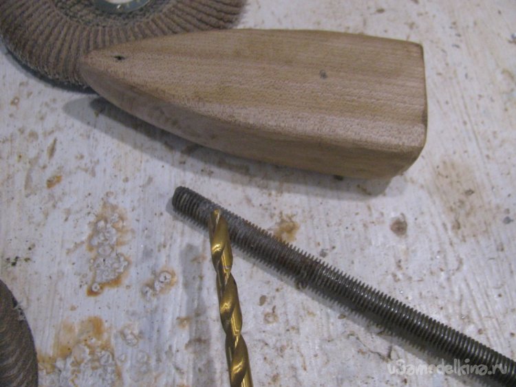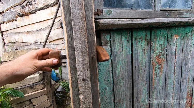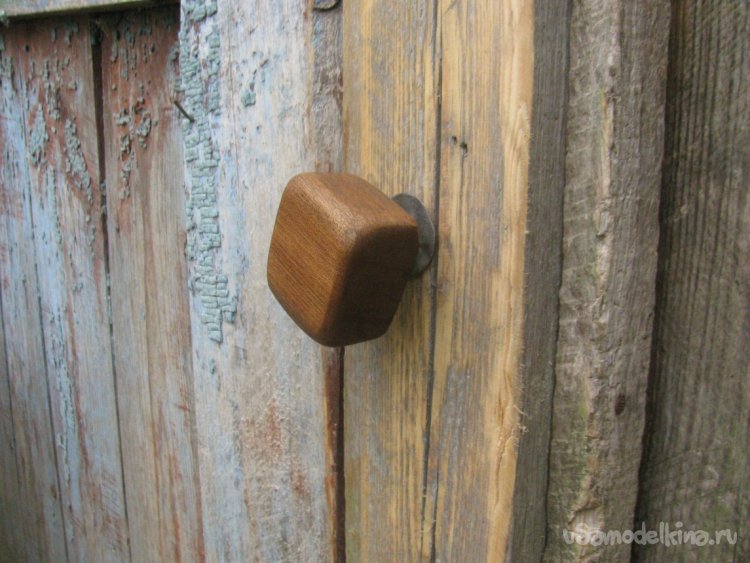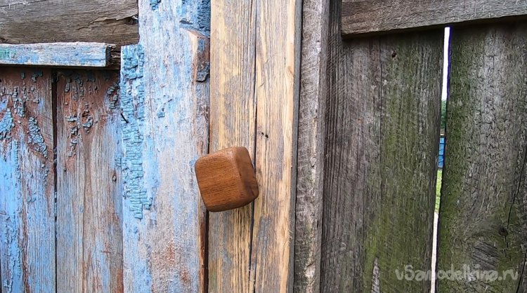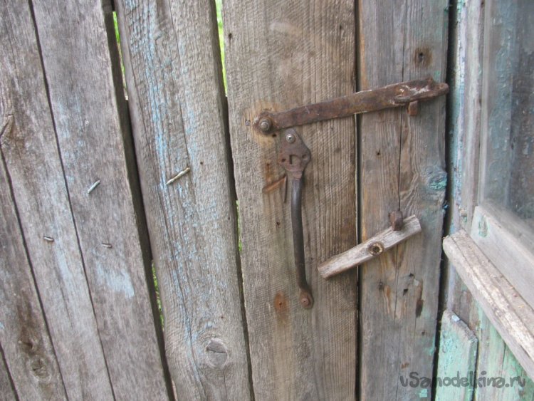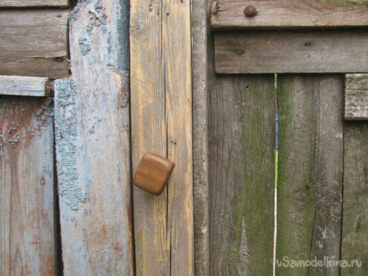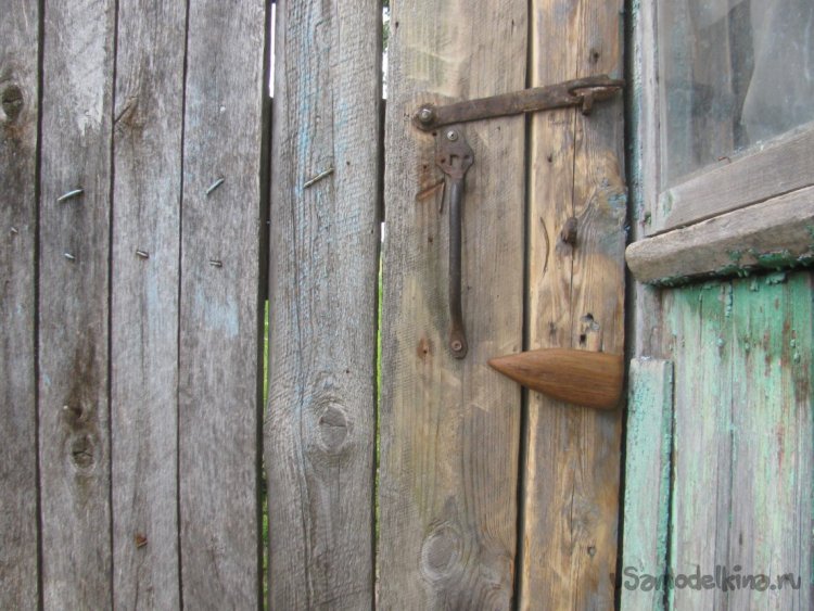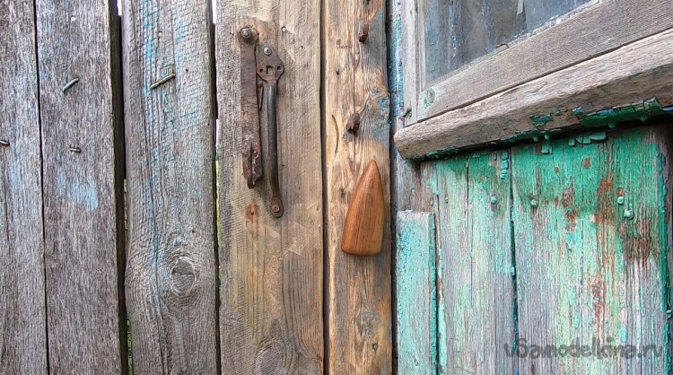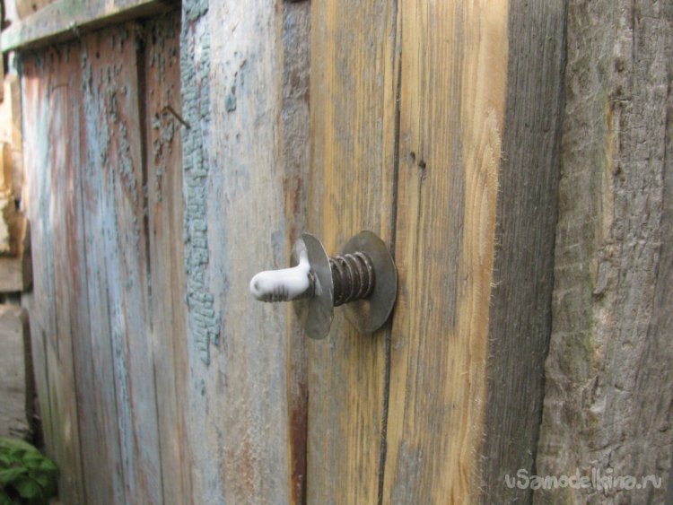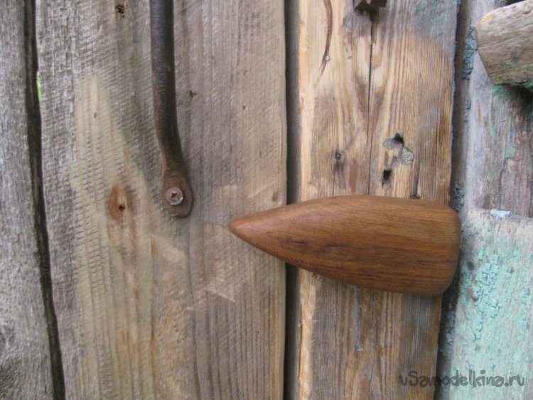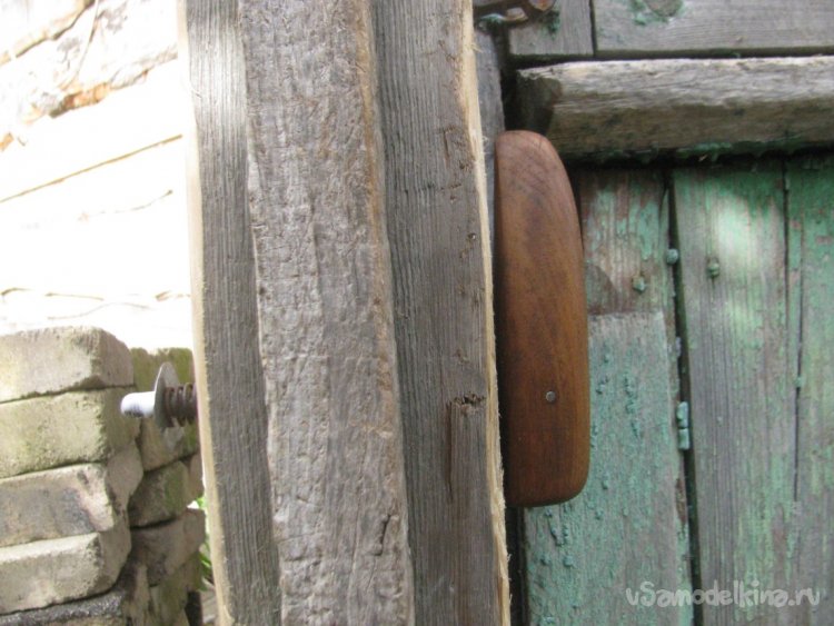 Подготавливаем место, срезаем все лишнее. Далее останется просверлить отверстие для шпильки. Конец шпильки намазываем клеем ПВА и накручиваем ручку. Вот и все, задвижка готова, смотрится отлично, в деревенском духе. Немного усилий и жизнь уже проще и приятнее.