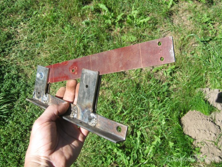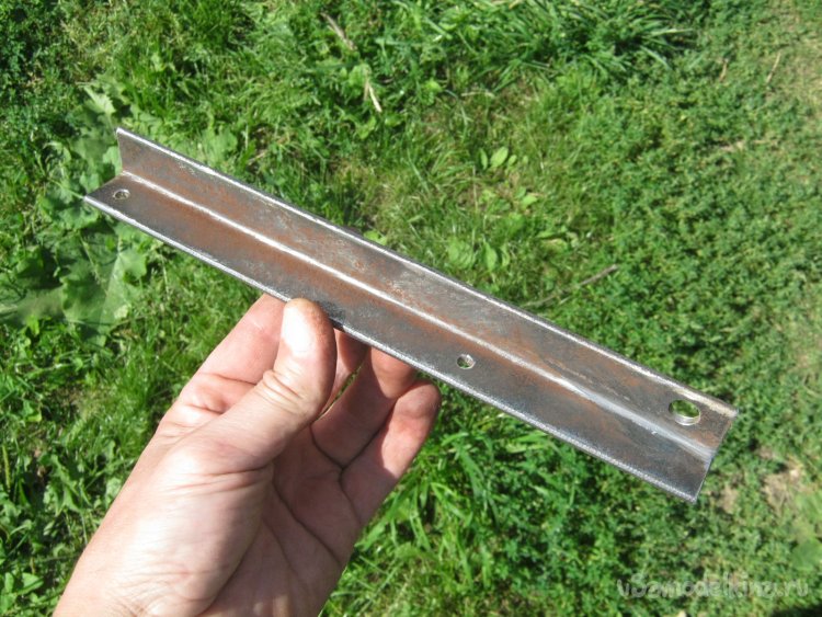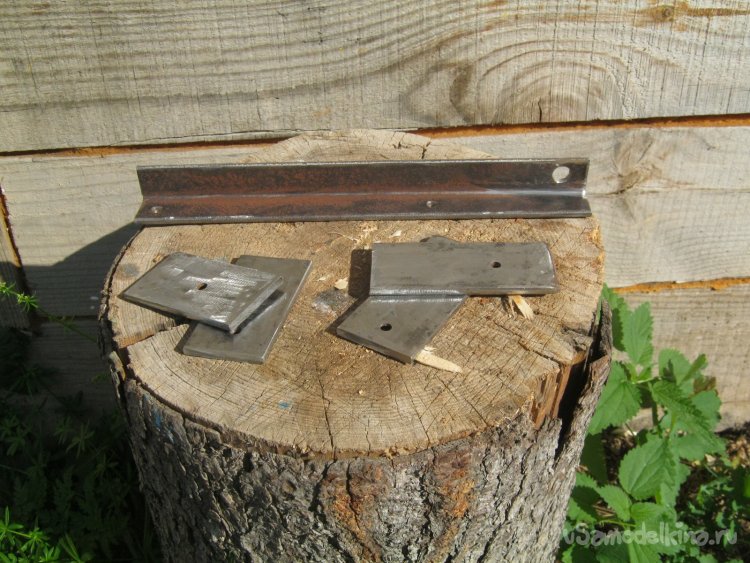 Фото 3. Из нетонкой стальной полосы, разметил и вырезал заготовки боковых направляющих и держателей качающегося рычага. Зачистил заготовки от ржавчины и заводской окалины абразивным диском небольшой УШМ. Отверстия в заготовках – достались в наследство от деталей-доноров, в новой конструкции они не мешают.