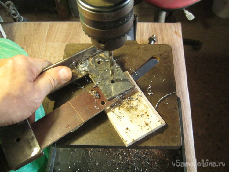 Фото 7. Разметил, накернил, просверлил отверстия для оси рычага. Сверлил на станке в два приема – сверлом тонким, сверлом нужного диаметра. Для точности. Отдельно, разметил и аналогично просверлил конец пластины-рычага. Надфилем и наждачкой зачистил заусенцы.