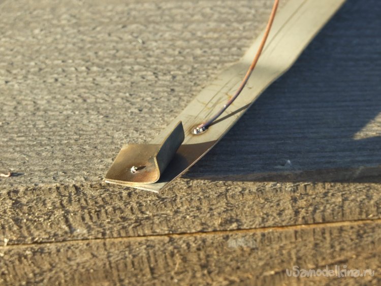 Фото 13. Сваренные куски ленты из мягкой немагнитной нержавейки ~0,7 мм. Рядом, приваренная к ней медная проволочина 1,3 мм. Видно, что при таких токах и выдержках медные проволочные электроды начинают прилипать. Лучшую стойкость покажут плоские каплеобразные электроды из бронзовой пластины, хотя бы 3 мм толщиной, например, выпиленные ювелирным лобзиком.