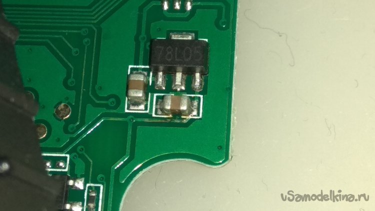 Потребления тока нет. Нашел на плате стабилизатор напряжения 78L05. Проверяю напряжения на входе и выходе, напряжения нет. При внимательном рассмотрении обнаружил сгоревшую дорожку. Между корпусом стабилизатора и правым входным контактом короткое замыкание.