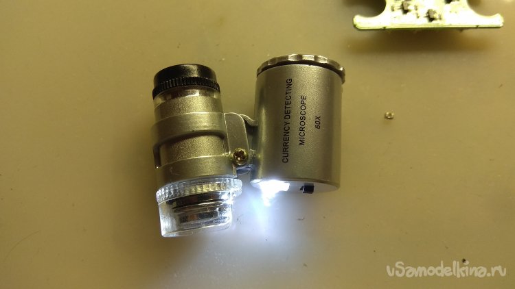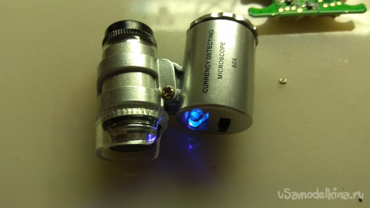 Микроскоп использую малогабаритный с подсветкой, купленный на Алиэкспресс. У него два режима подсветки: белый и ультрафиолетовый.