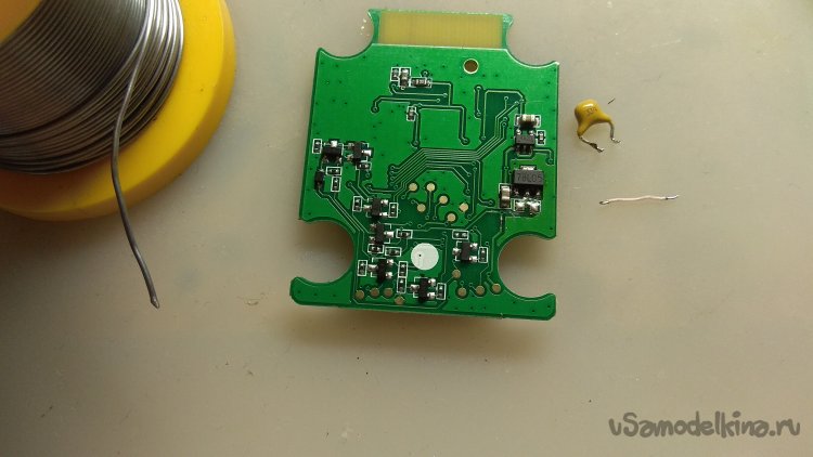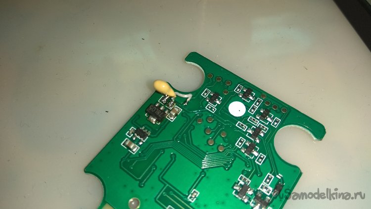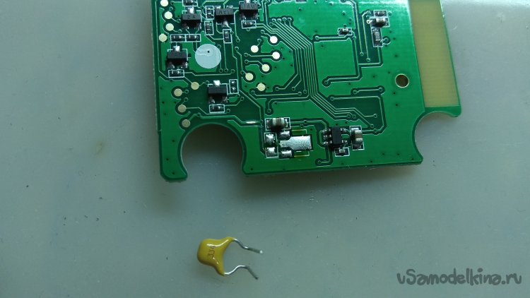По даташиту на входе стабилизатора должен быть установлен конденсатор емкостью 0,33мкФ. Не стал искать б/у SMD конденсатор с неизвестным напряжением, нашел в запасах вариант надежнее.