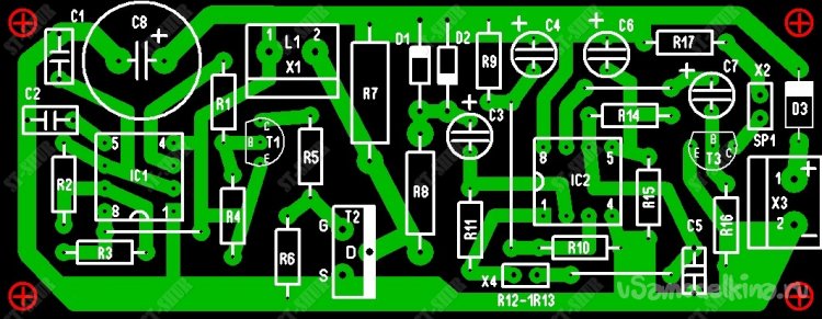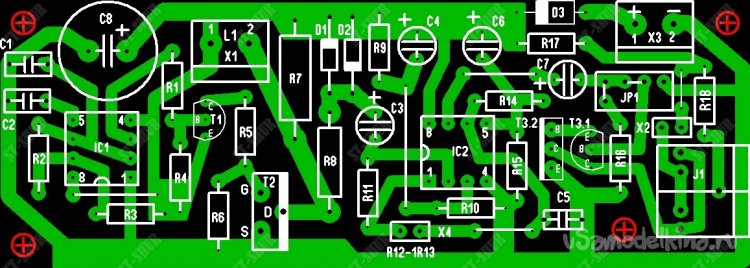 Просмотрев приличное количество статей в интернете, посвященных данной схеме металлоискателя, а так же вариантов готовой разводки печатных плат всё же решил скорректировать п/п под свою идею. А именно удобство установки б/у радиодеталей (т.е. «лежа», из-за коротких выводов) и наличия крепежных отверстий.