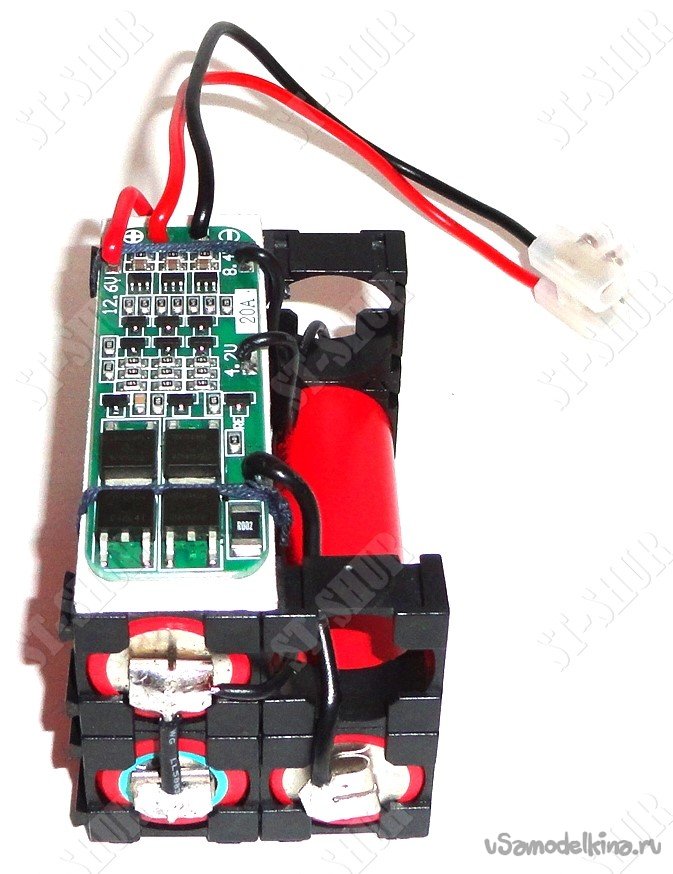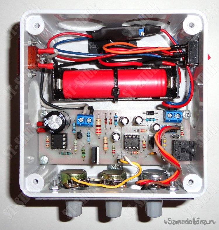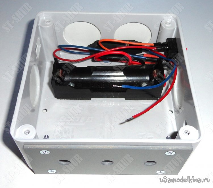 Для установки аккумулятора и возможности его простой замены применен бокс с довольно жесткими контактными пластинами который закреплен в корпусе винтами М2,5мм. Дополнительно аккумулятор зафиксирован капроновой стяжкой. Использование боксов с контактами в виде витых пружин очень не рекомендуется т.к. при токе заряда более 1А пружинки начинают довольно сильно греться.