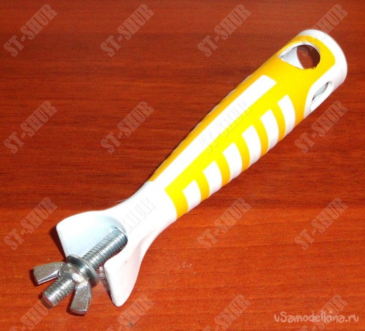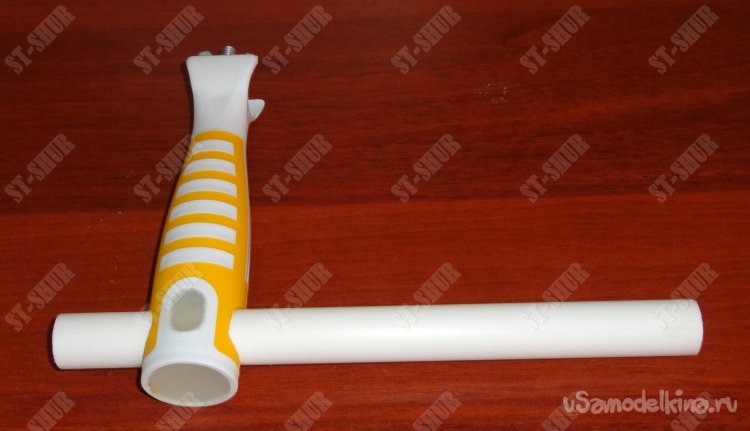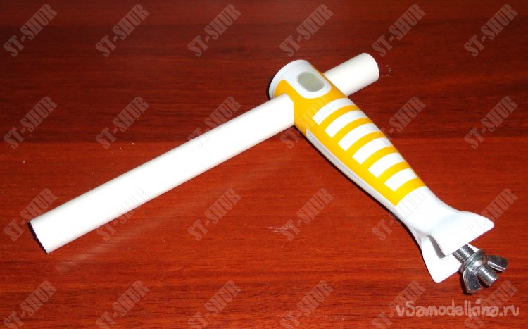Поскольку в план изготовления конструкции входила максимальная простота при достаточном удобстве, то решил отказаться от различных вариантов изогнутых штанг (виденных в разных конструкциях на просторах интернета). Поэтому расчет был сделан на возможность удобного использования любых прямых реек. Таким образом, было решено закрепить трубку для крепежа электронного блока на рукояти, которую в будущем можно использовать с различными прямыми штангами. В качестве рукояти использована рукоять от валика для краски. Для крепежа рукояти к штангам, используется болт диаметром 8мм, который закреплен насквозь в рукояти вместо конструктива для установки валика (с помощью клея). Так же внутри рукояти шестигранная шляпка болта дополнительно зафиксирована термоклеем, что обеспечило достаточную надежность конструкции. В рукояти с помощью МФИ «Dremel» были вырезаны отверстия для установки пластиковой трубки диаметром 20мм.