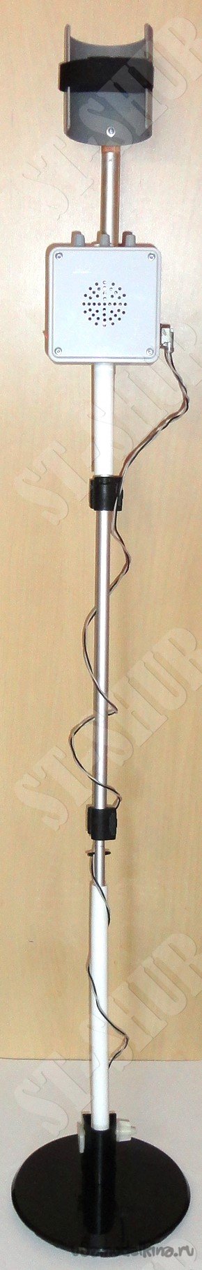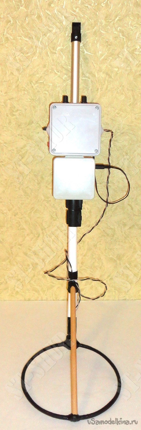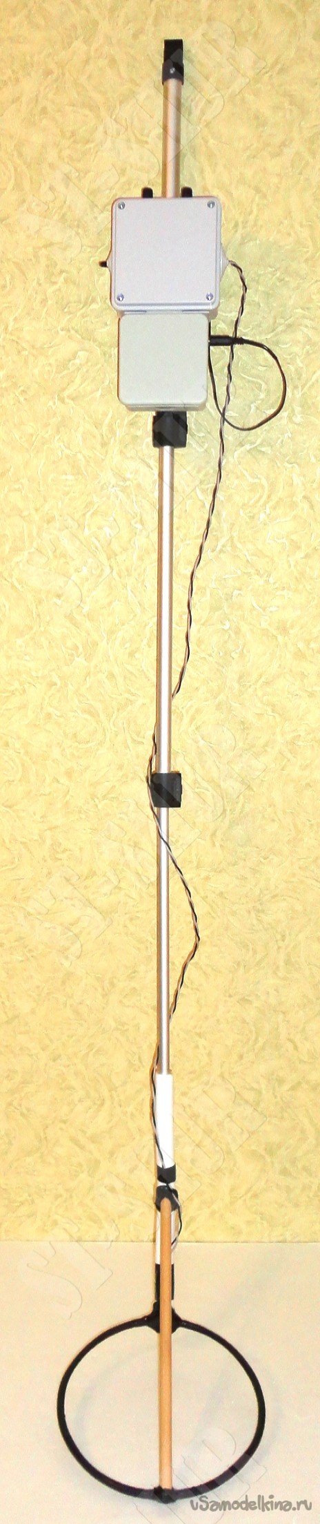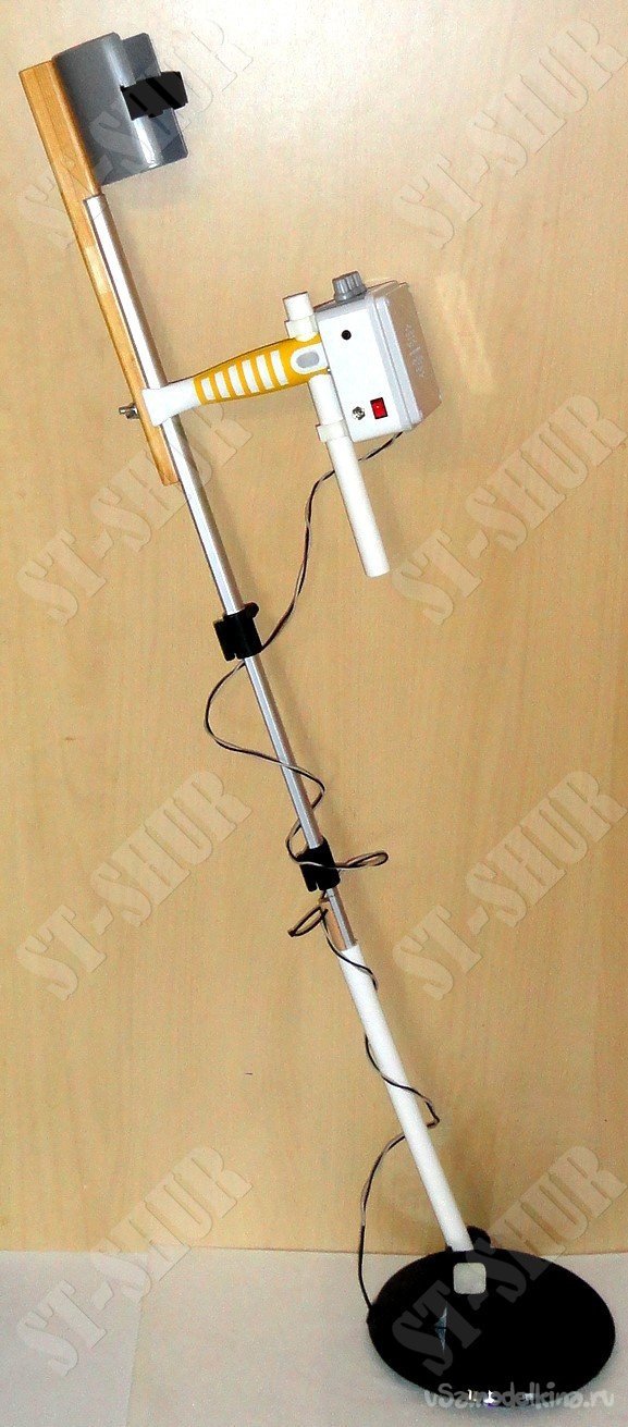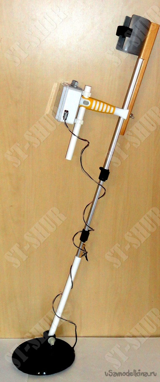 Для отвода алюминиевой штанги от поисковой катушки использован обрезок пластиковой трубы диаметром 20мм и длинной 315мм. Трубка крепится к съемной горловине от подставки с помощью пластикового винта с пластиковой гайкой диаметром 8мм (от сантехники). Горловина крепиться к основанию подставки с помощью встроенной защелки, что довольно удобно при сборке и разборке.