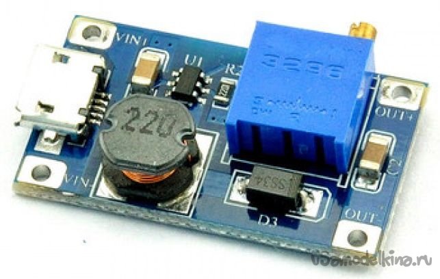 Для питания этого варианта конструкции пока предусмотрен один Li-ion аккумулятор типоразмера 18650 емкостью 2.5 А/ч, с использованием китайских модулей защиты и контроля заряда-разряда и регулируемого преобразователя DC-DC B6288 (с рекомендованным выходным током до 1А и максимальным до 2А). Оба модуля упакованы в термоусадочные трубки.