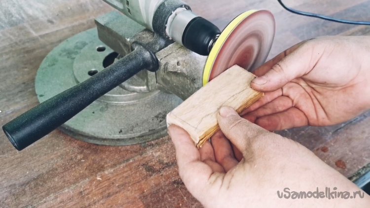 Для охлаждения я подставлял заготовку к вентиляции дрели, это обеспечило мне охлаждение. На ноже я сделал также с помощью этой дрели, что заняло часа два. После того как я из заготовки сделал форму ножа, принялся стачивать толщину лезвия. Обрабатывать заготовку не самое интересное занятие поэтому я переключился на рукоять. В качестве материала выбрал дерево дуб, начертил на бруске разметку я начал придавать ему форму. Для начала я отрезал с обеих сторон лишний материал. Затем с помощью дрели всё с тем же шлифовальным кругом убрал всё лишнее.