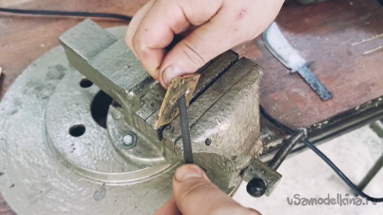 Когда и я придал форму рукояти пришло время вставки. Латунь использовал от петли двери, так как латунные петли периодически ломаются и это отличный материал для подобных дел. В рукояти надо было сделать отверстия для клинка для этого я зажал сверло в дрель. И насаживал рукоять на сверло. Тем самым идеально можно попасть по вертикали и горизонтали, что не мало важно. Просверлив несколько отверстий движение вперёд вниз-вверх я сделал сверлом широкую полосу для хвостовика клинка. Надев латунную заготовку я вставил её в рукоять и принялся обрабатывать уже в сборе. Подогнать всё по идеалу, достал клей поксипол. При работе поксипол важно учитывать что он сохнет за 5 минут. Смешав два компонента я быстро нанёс на хвостовик ножа клей нанёс клей на рукоять. Склеив все компоненты я ещё раз обработал всё на станке Это я так называю дрель со шлифовальным кругом.