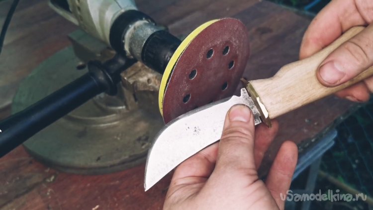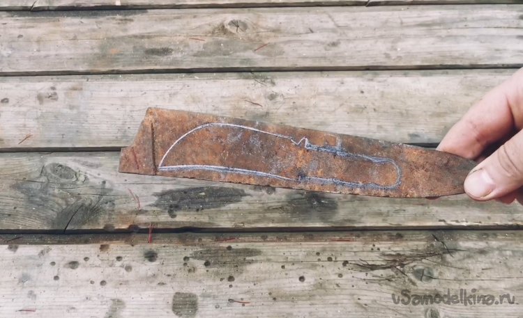 Сталь самое интересное, даже полоса в 1 мм не гнётся, а ломается с хрустом. Обрабатывать в итоге пришлось долго и мучительно)). И так, для начала я разметил форму ножа своей заготовке, а затем я обрезал болгаркой всё лишнее. После обрезания на дрели со шлифовальным кругом я довёл заготовку для нужной формы. При работе нож сильно грелся, что создавало проблемы.