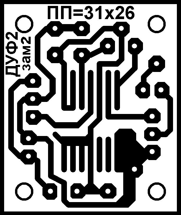 Переносить рисунок ПП на фольгированную медью сторону, следует при помощи ЛУТ (Лазерно-утюжной технологии). Ручная рисовка кислотостойким маркером довольно затруднительна, так как в схеме ДУФ2 использована малогабаритная .smd микросхема с шагом (расстоянием между выводами) 1,25 мм. Эта ИМС, в отличие от остальных деталей, располагается на обратной (фольгированной) стороне ПП.