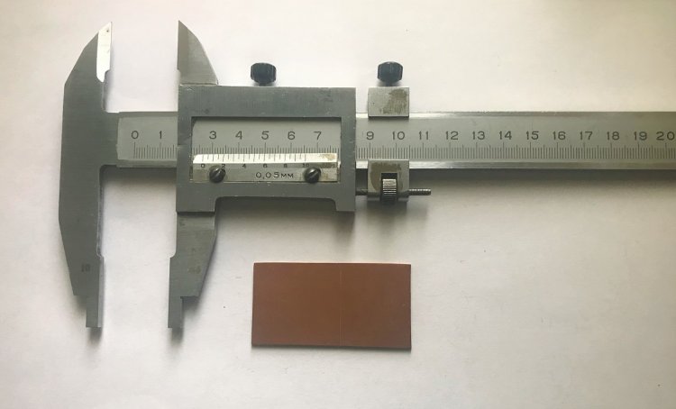 Размеры ПП ДУФ2 отмеряют штангенциркулем от прямого угла на заготовке из односторонне фольгированного стеклотекстолита толщиной не менее 1 мм.