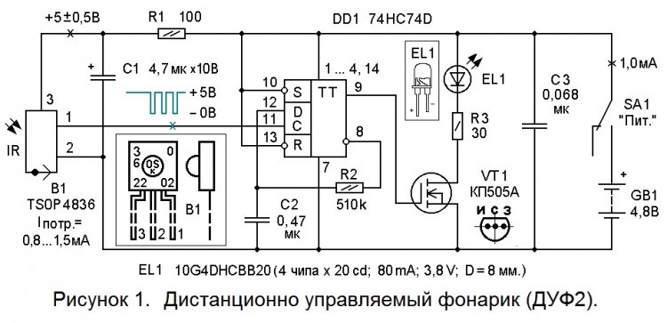 Вторая отличительная особенность ДУФ2 заключается в максимальной простоте схемы. Из состава применённой ИМС используется только один D – триггер, а второй – незадействованный – можно использовать для творческой доработки схемы. Так, например, на основе второго триггера можно создать одновибратор, который будет автоматически выключать ДУФ2 по истечении нескольких минут после включения осветительного светодиода пультом ДУ. Это позволит избежать бесполезного разряда аккумуляторов оставленного – по невнимательности или забывчивости - во включённом состоянии ДУФ2.