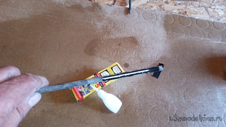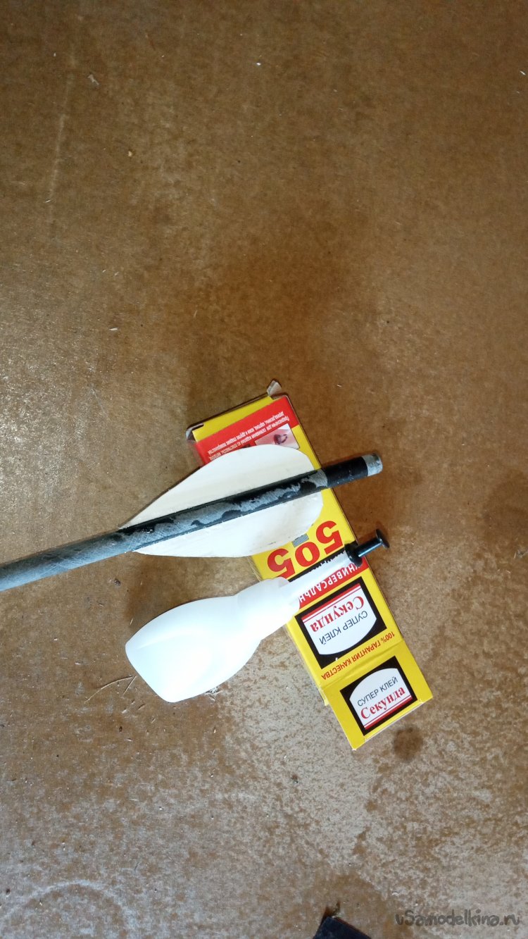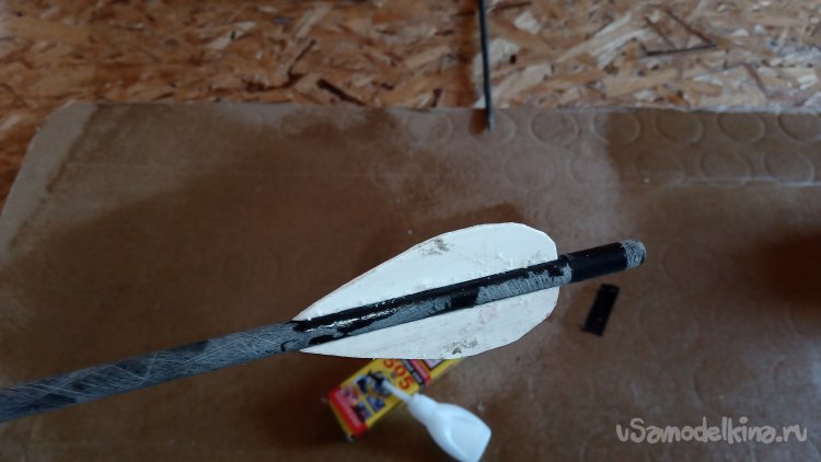 Собирал заднюю часть болтов, используя суперклей (цианоакрилат). Оперение было приклеено к стержням. Для обеспечения одинакового расстояния от конца, была использована полоска изоленты, наклеенная в качестве шаблона. Внутрь трубок были вложены, смазанные клеем, обрезки гвоздей, шляпки которых будут служить концевиками, принимая на себя удары тетивы