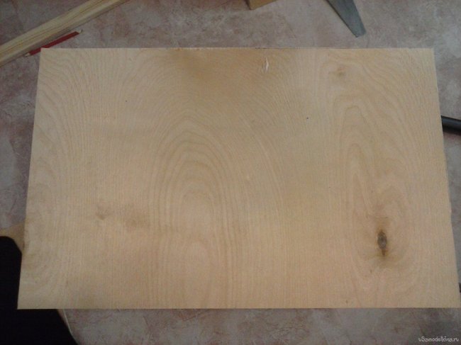 Кусок фанеры отрезаем по размеру материала. Данную операцию легко осуществить в крупном строительном магазине, где осуществляют бесплатную распиловку при покупке.