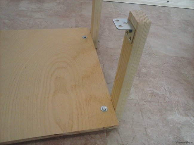 Закрепляем бруски с уголками к фанеры с помощью болтов (отверстия как и раньше делаем дрелью).
